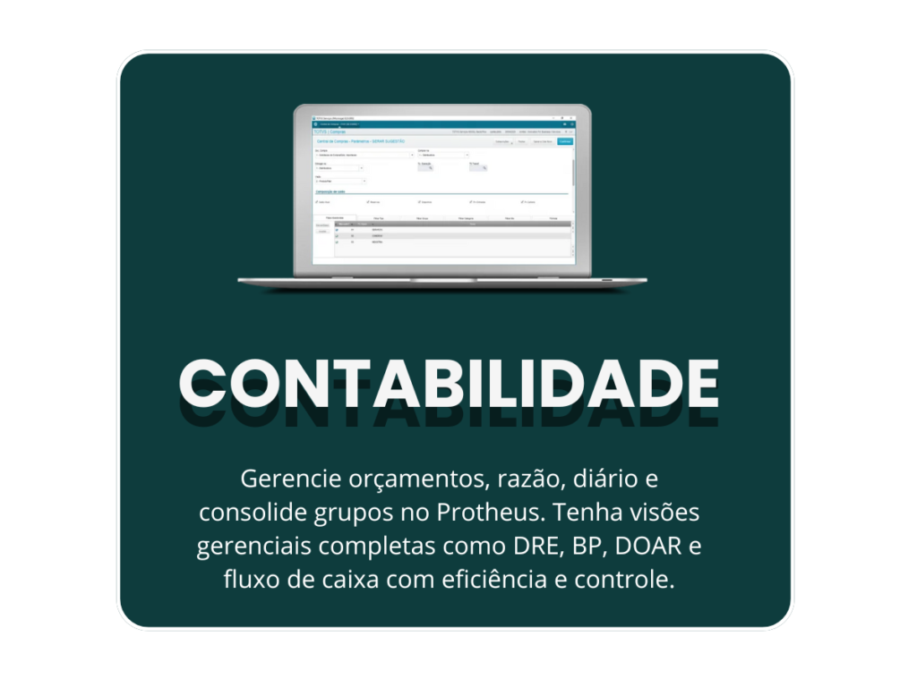 Com o ERP Protheus, você centraliza os dados de todas as áreas da sua empresa em um único lugar e automatiza seus processos de forma eficiente.